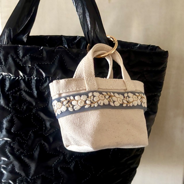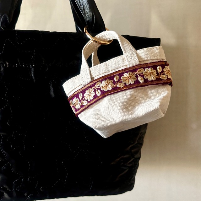 帆布とインド刺繍リボンのミニミニトートバッグ チャーム カラビナ付 キャンバス