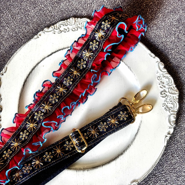 【最大140cm調整可】インド刺繍リボン ストラップ スマホショルダー スマホストラップ インド刺繍 フリル フリルショルダー