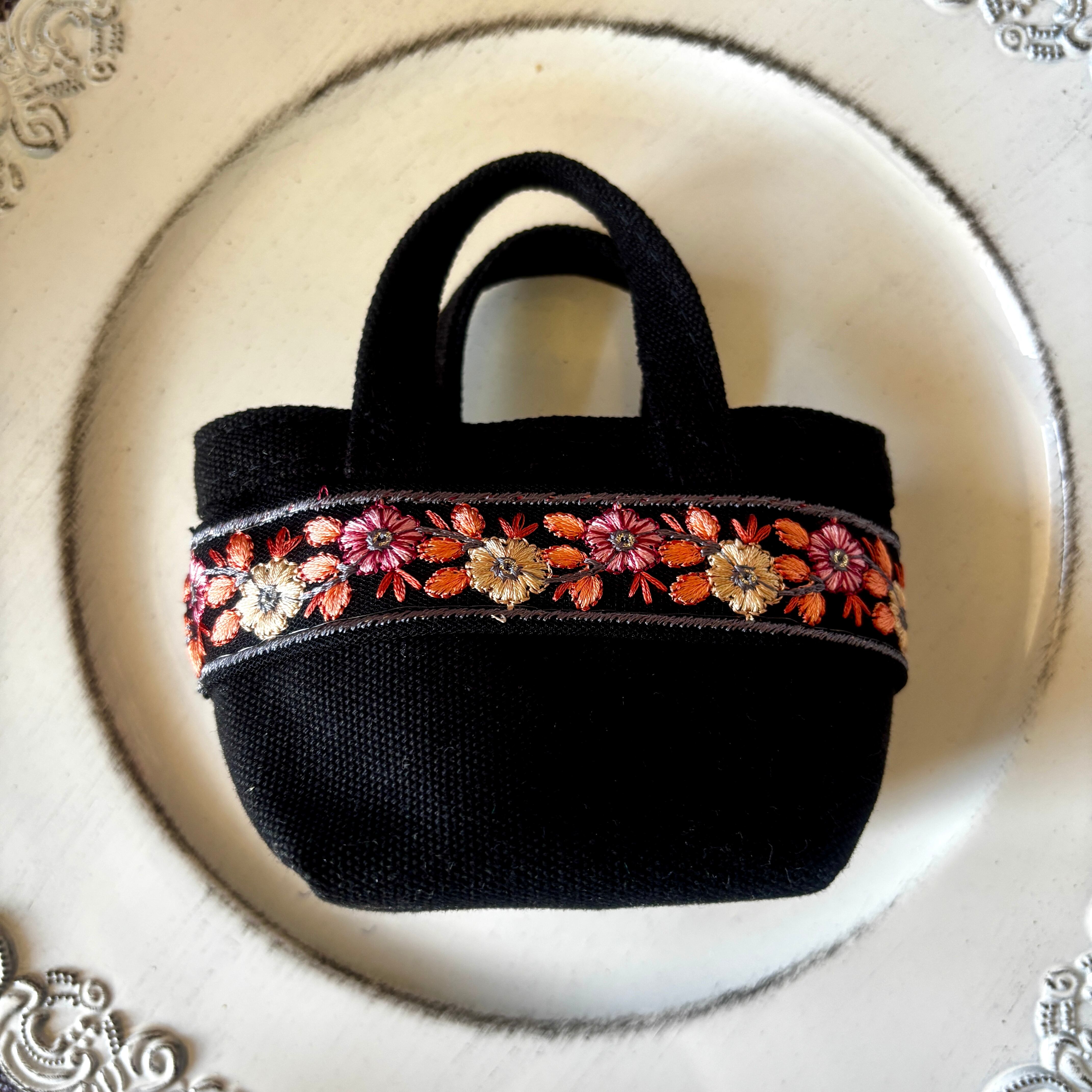このミニミニトートバッグは、丈夫な帆布と美しいインド刺繍リボンを組み合わせた特別なデザインです。カラビナ付きなので、バッグのアクセサリーやお好きなアイテムと一緒に使って、おしゃれ度をアップさせましょう!