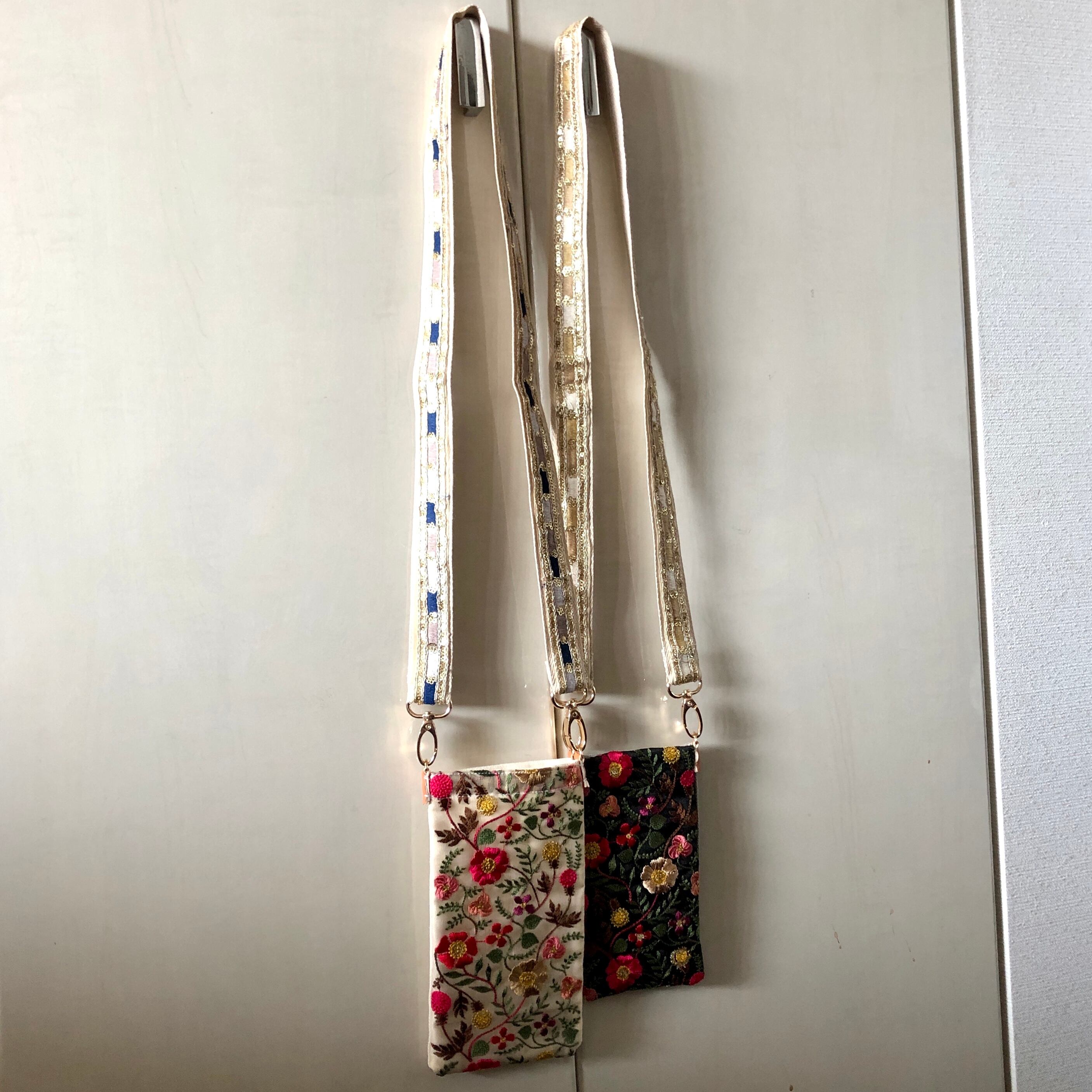 18×8cmスマホポーチ/サコッシュ ツイスト紐付き ショルダーストラップとセットアップできます。インド刺繍リボン