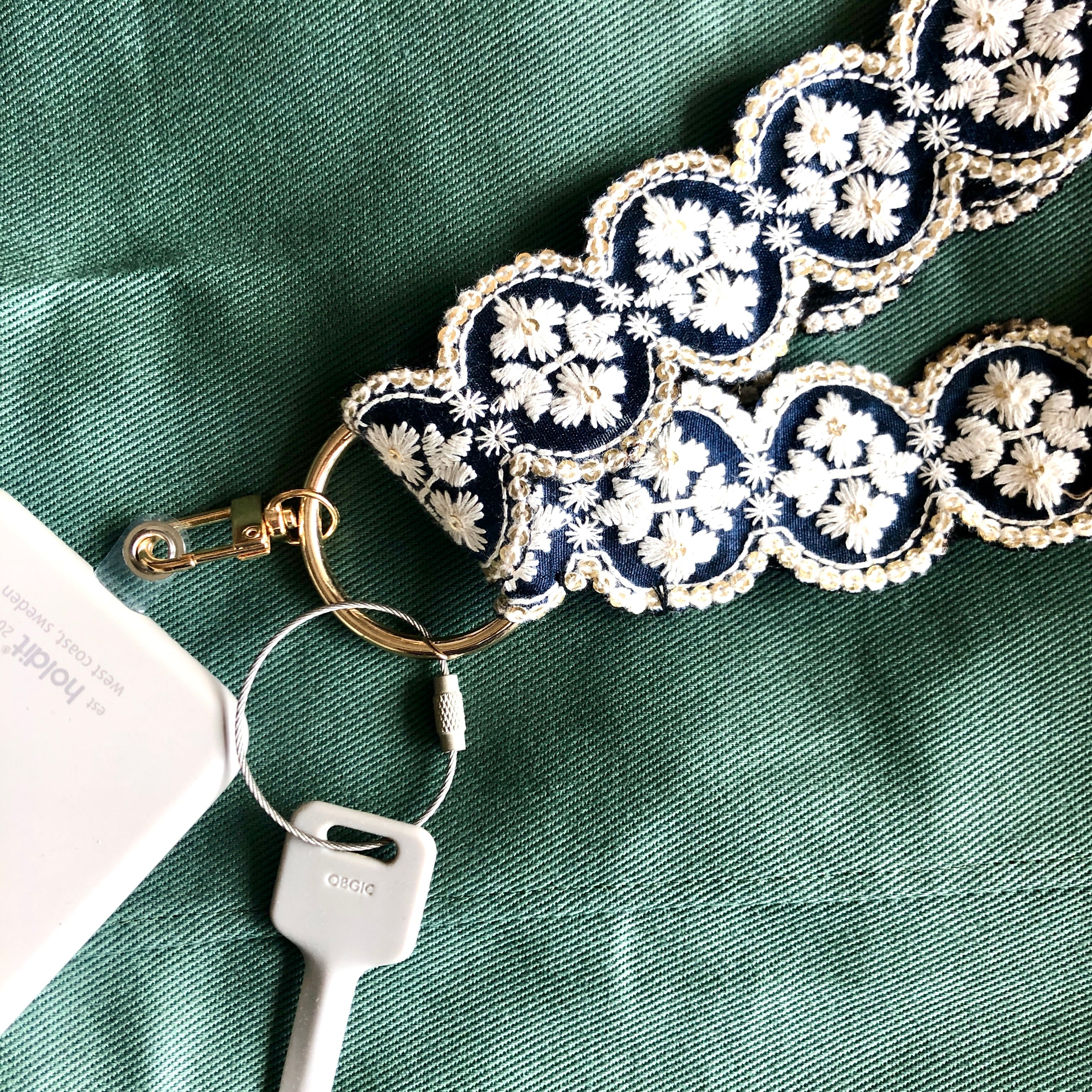 最大140cmまで長さ調整可能なインド刺繍リボンのストラップは、スマホショルダーやスマホストラップとしてご利用いただけます。