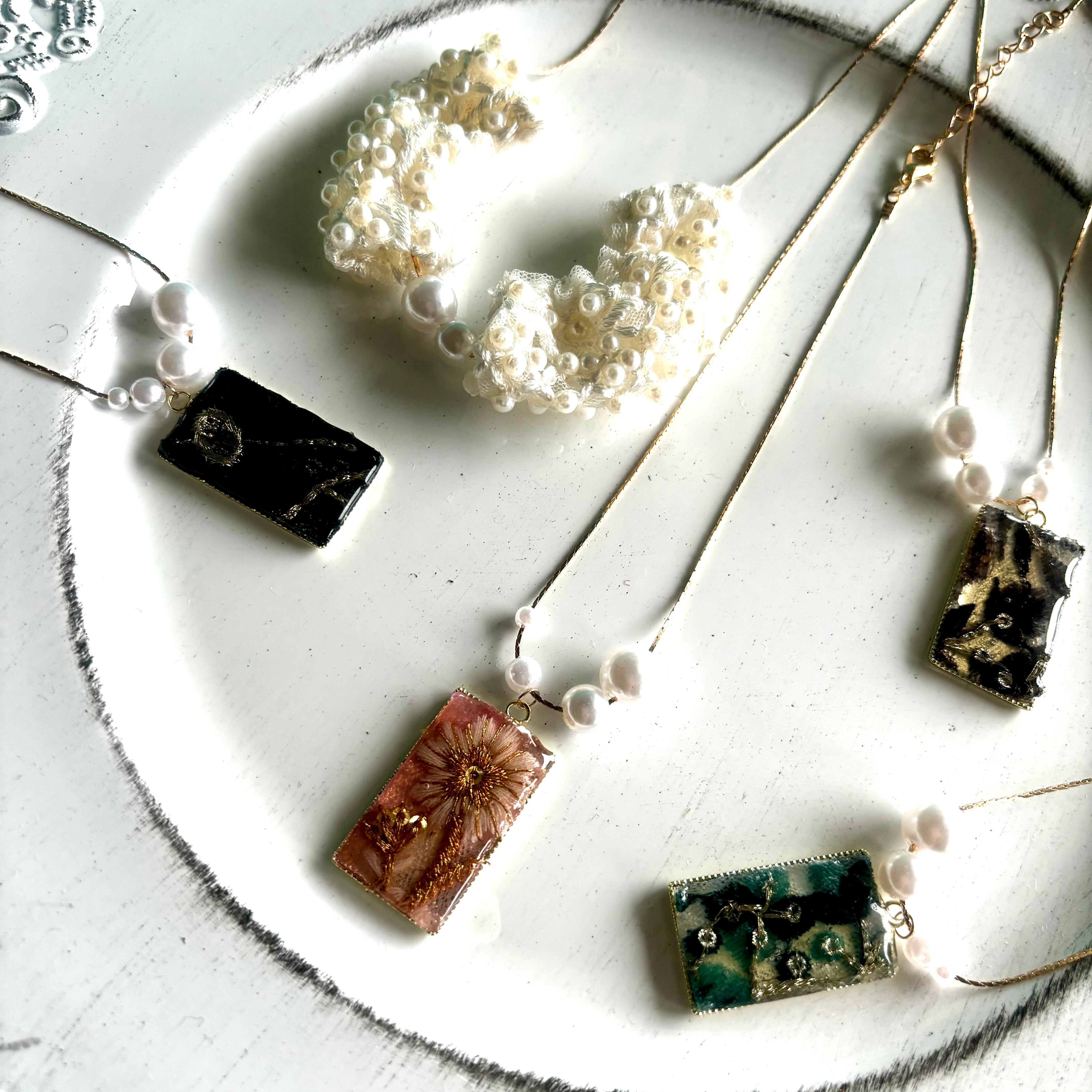 インド刺繍リボンのネックレス レジンとパール