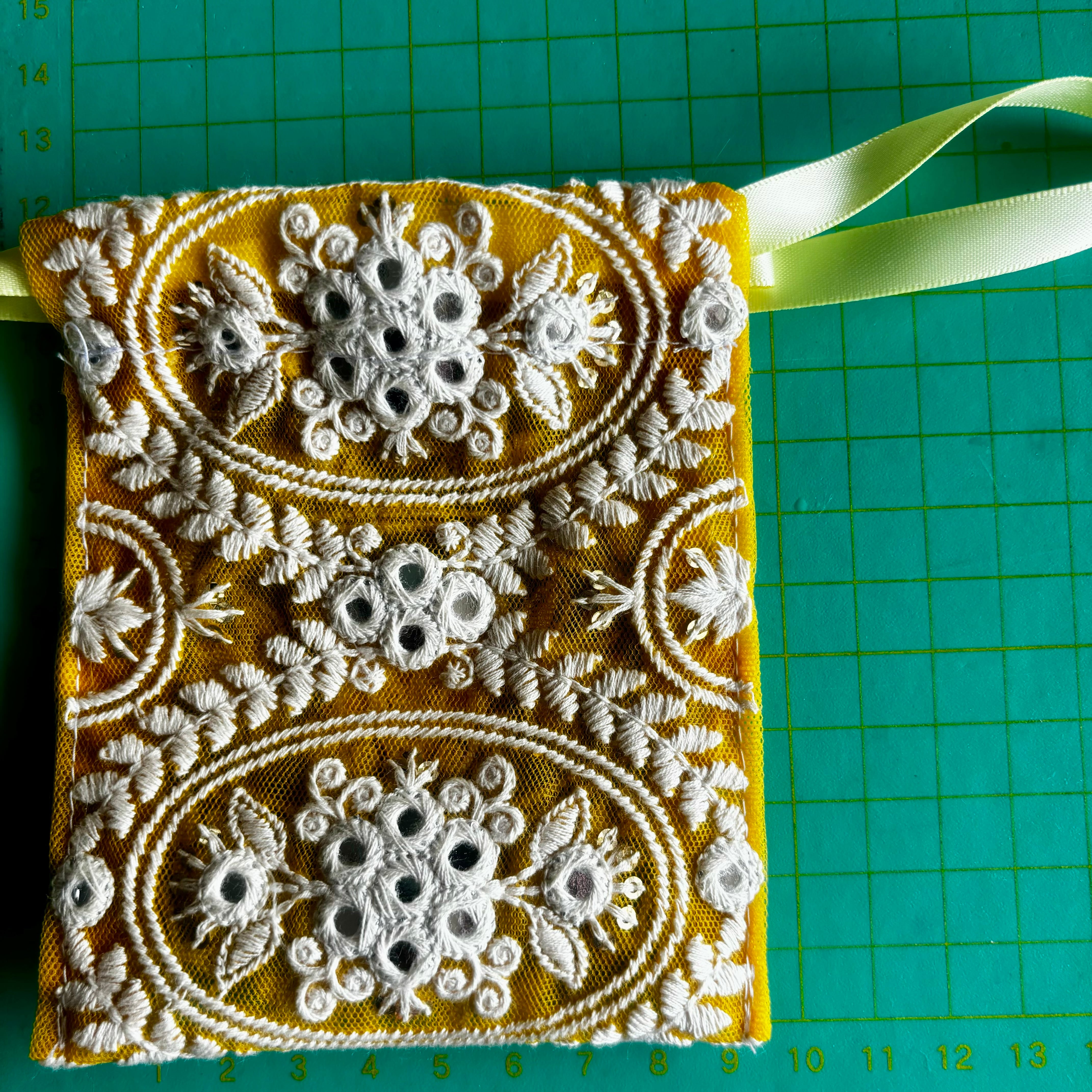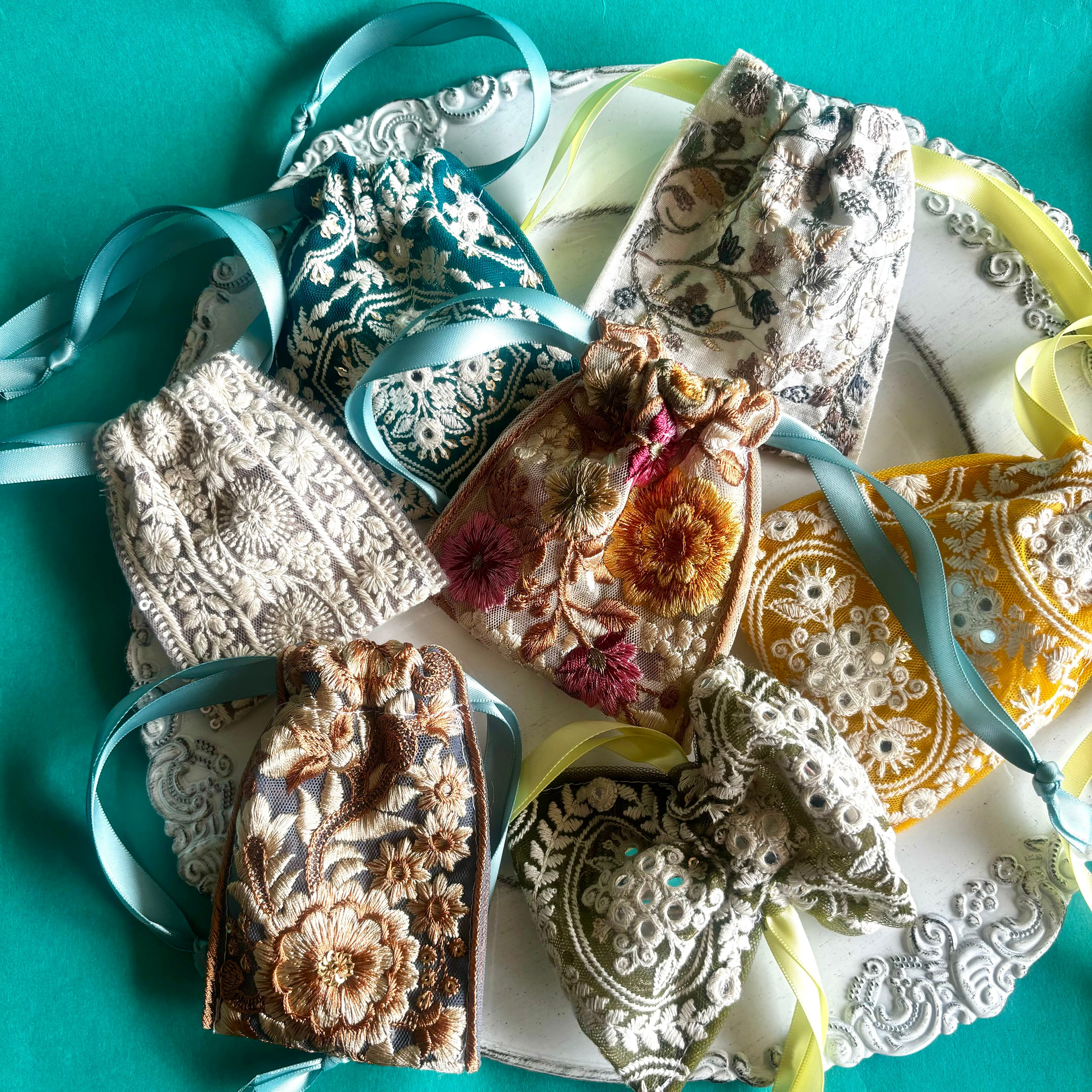 インド刺繍リボンのミニ巾着は、エキゾチックな魅力と繊細なデザインが特徴です。透け感のある素材に、インドの伝統的な刺繍リボンが施されており、どんなコーディネートにもアクセントを加えてくれます。小さなサイズながらも十分な収納力があり、コスメやアクセサリー、小物などをスタイリッシュに持ち歩くことができます。