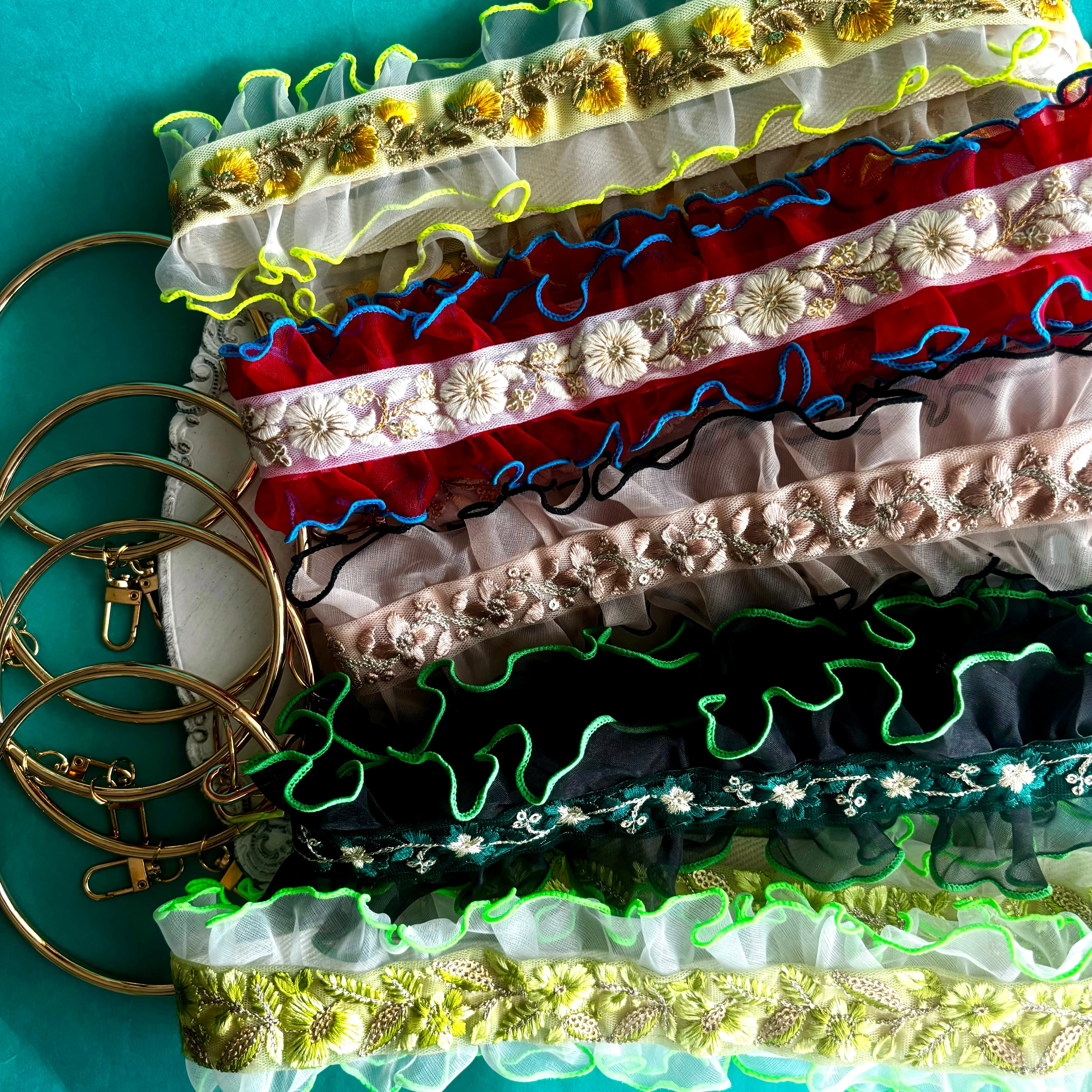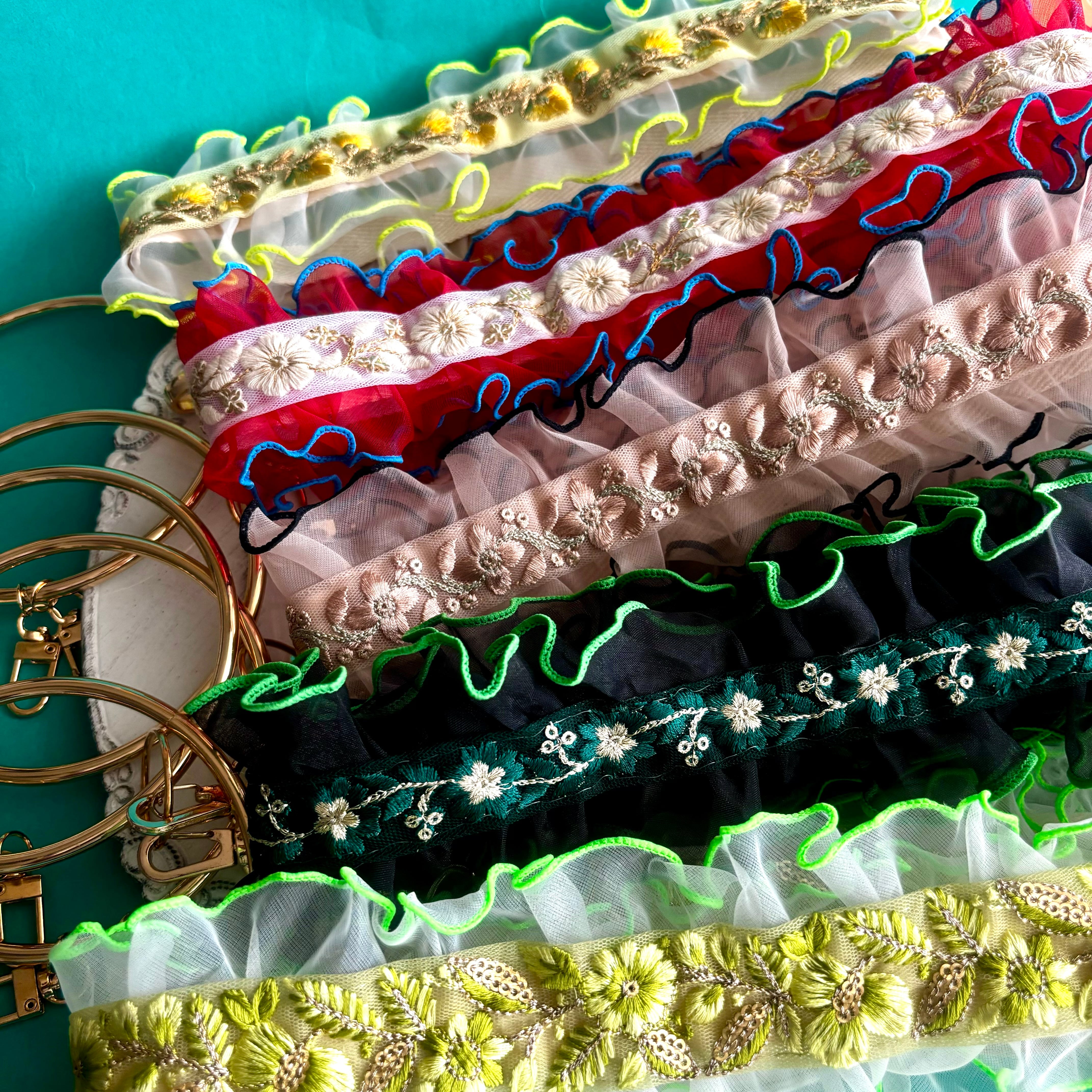 フリルとインド刺繍リボンがエレガントなアクセント。日常に彩りを添える一品として、是非お楽しみください。